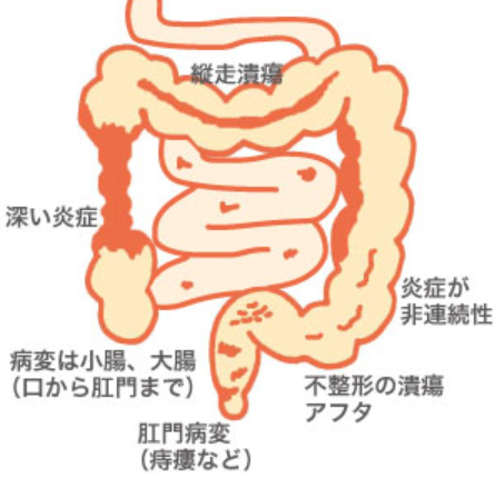 特に、胃と大腸のあいだにある小腸や、大腸の一部に炎症が出やすいのが特徴とされています。